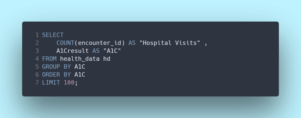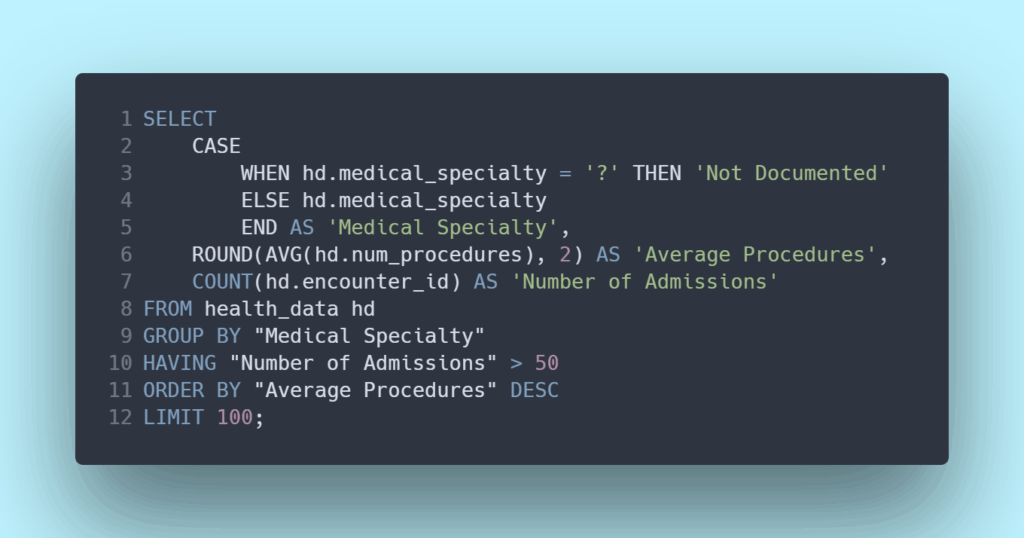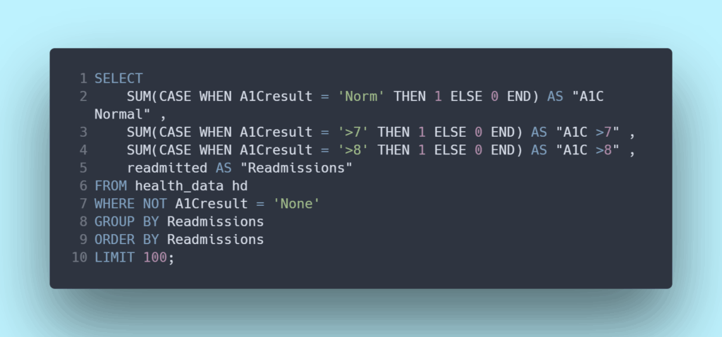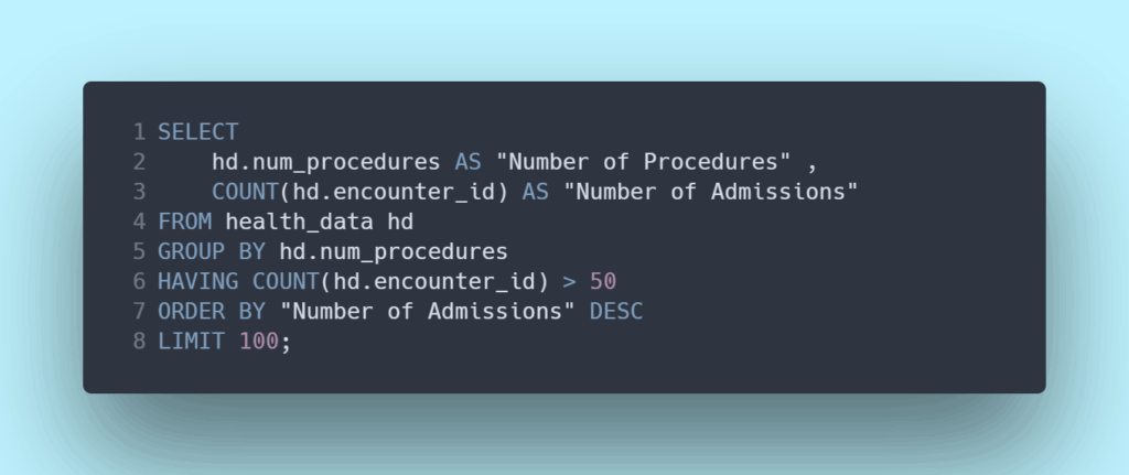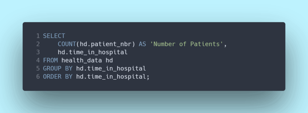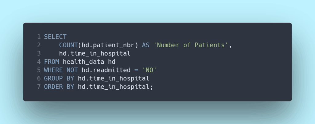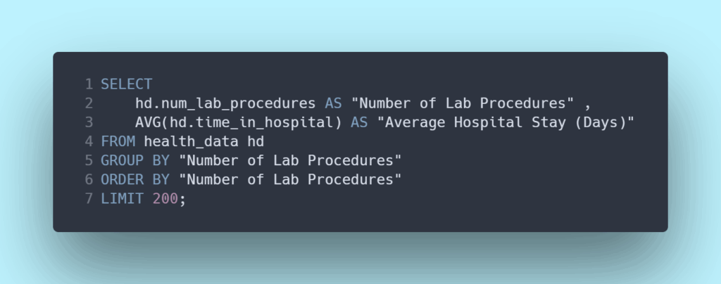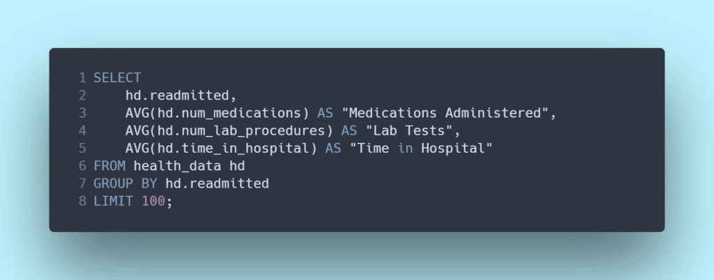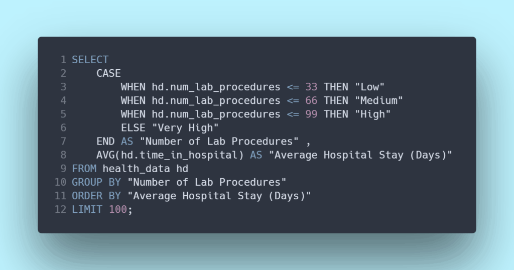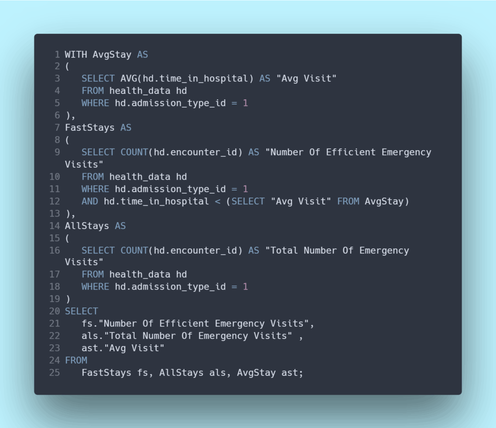 I used multiple CTEs to calculate the average stay in the hospital, an “efficient” stay in the hospital which was less than the average, and the total number of patients admitted through the Emergency Dept.