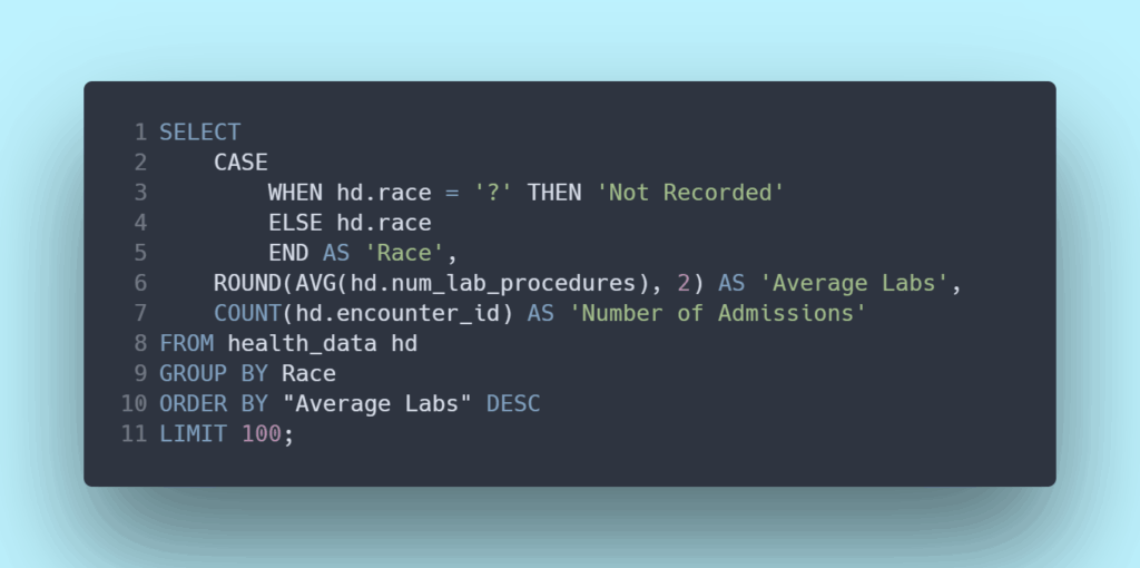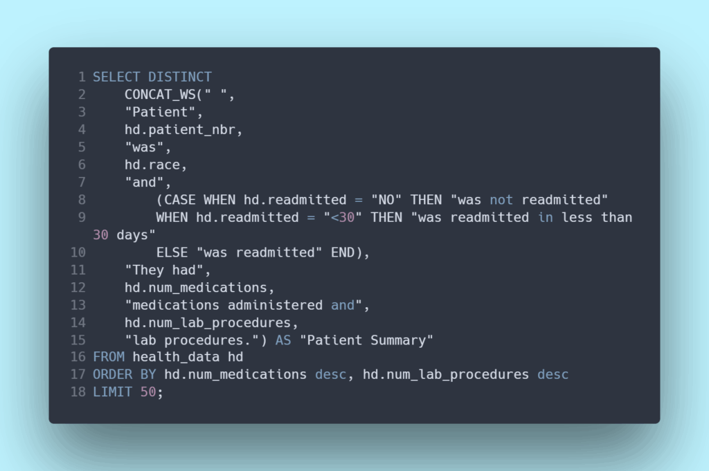 12) After looking at the Emergency Dept I made use of the CONCAT function in SQL to build a text based summary of a patient based on information from multiple different sources in the data set. The result included the patient’s race, number of medications administered, number of labs ordered, and readmission status.