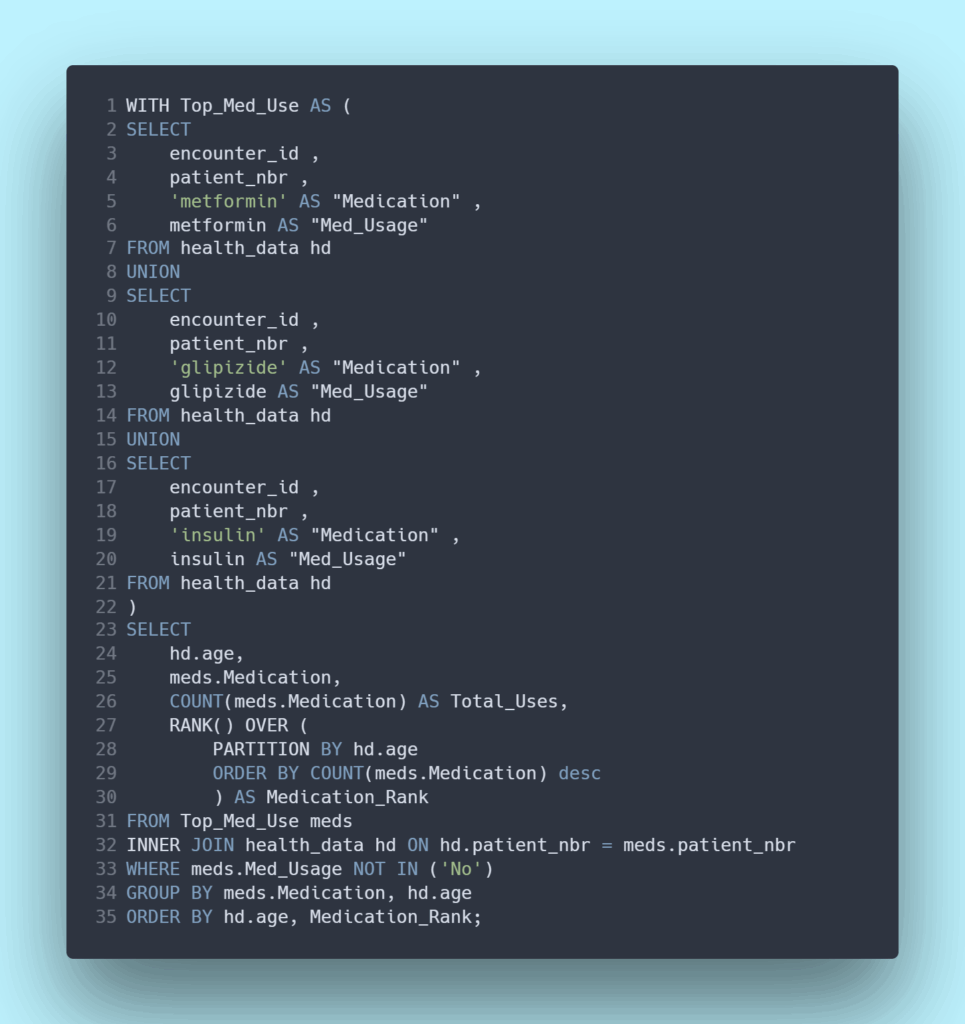 The query below first uses the UNION command to rearrange data originally in a wide format to a long format and places that reorganized data into a CTE. I then used the RANK window function to rank the 3 medications based on how many times they were prescribed. I grouped the result by age group to see if there was any difference in prescription frequency across age groups.
